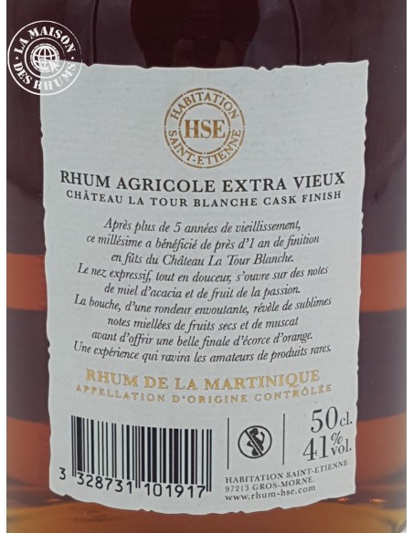 Ce Rhum HSE Vieux Finition Sauternes Château La Tour Blanche Millésime 2016 41% est une édition limitée à 4 100 exemplaires, embouteillée sans additif (conformément au cahier des charges de l'AOC Martinique) à 41%Vol.