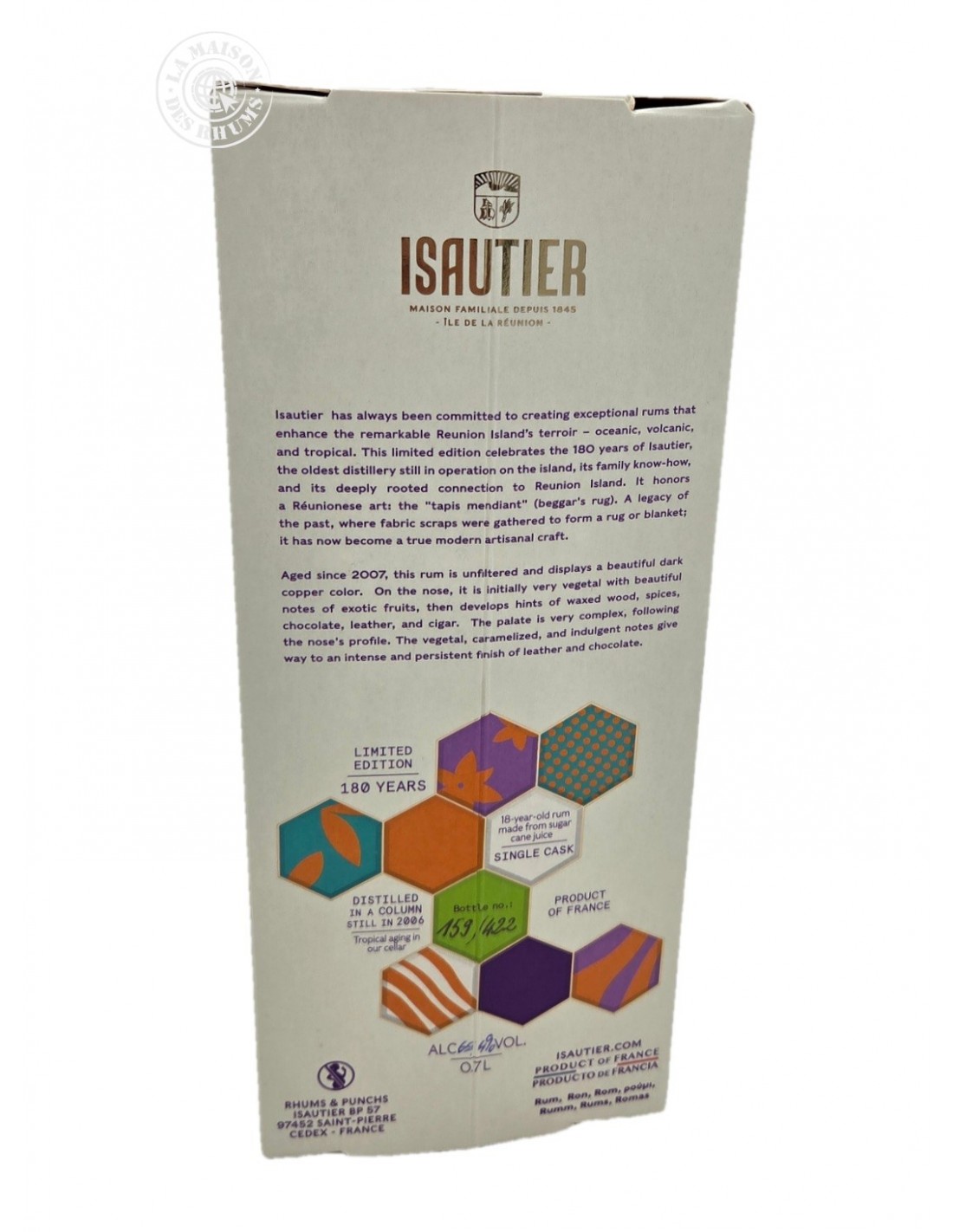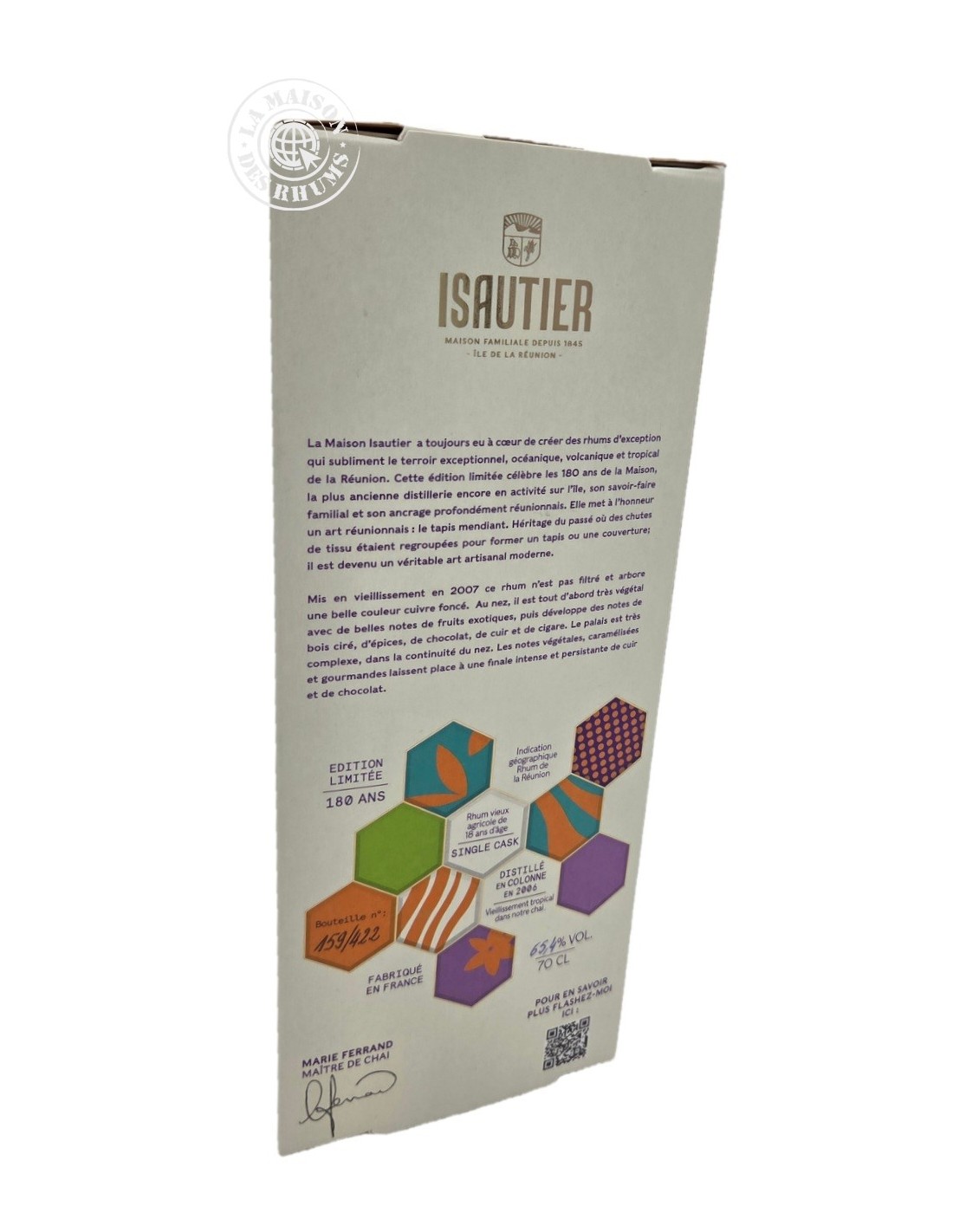 « Pour honorer 180 ans d’histoire, j’ai sélectionné un des plus vieux rhums de notre chai. Ces 18 années en fût ont permis à ce rhum agricole de développer des notes de chocolat, de cuir et de bois ciré, que seul le temps peut créer. Mettre ce fût en bouteilles aujourd’hui, c’est transmettre la tradition, la richesse et la sagesse de la Maison Isautier à travers ce rhum d’exception ».