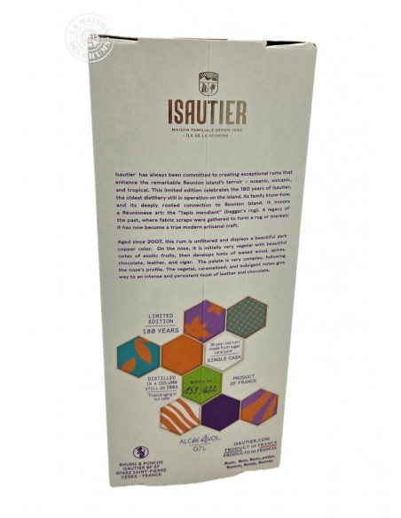 Le Rhum Isautier Vieux 18 ans 2006 Cuvée anniversaire 180 ans 65.4% est un fût unique (N°35202) sélectionné avec le plus grand soin par Marie Ferrand, Maître de Chai de la Maison Isautier, plus ancienne distillerie de l'île de la Réunion. Cette cuvée d'exception, réalisée à seulement 422 exemplaires numérotés à la main, est une bien belle manière de célébrer les 180 ans de la distillerie.