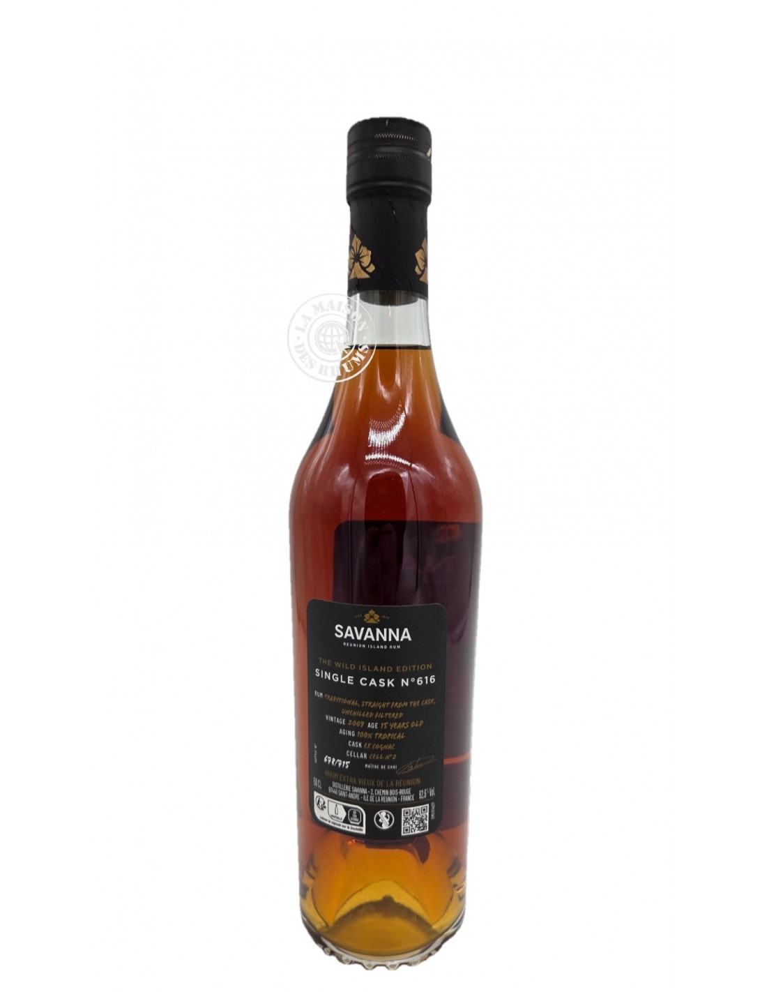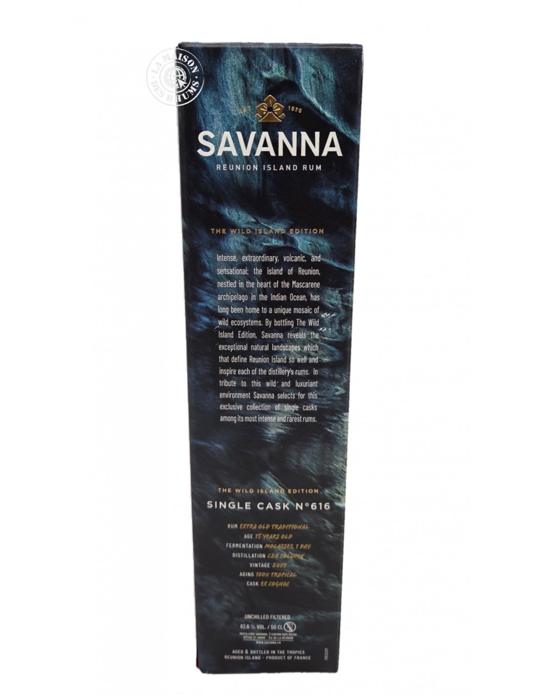 Ce Rhum Savanna Vieux Traditionnel The Wild Island - 2009 15 ans - Grotte Marine 62.6% 50cl a bénéficié d'un vieillissement tropical intégral sur l'île de la Réunion dans les chais de la distillerie, en ex-fût de Cognac.